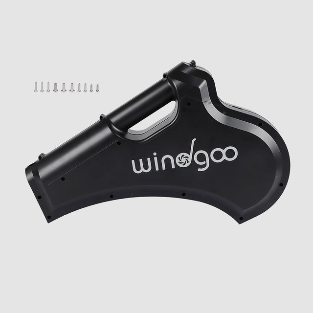 Black ABS+PC battery case with copper-colored nut, DC charging port and "Windgoo" screen-printed sticker