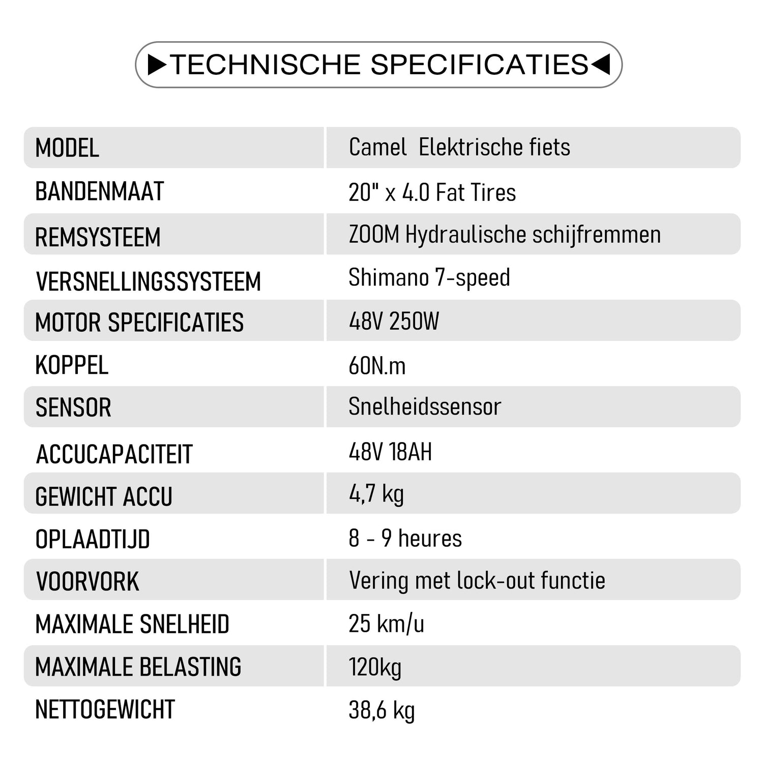 Are you looking for an electric cargo bike, an e-bike with baskets, or a family bike for groceries? Then the Maxtron Camel is the ideal choice. This cargo bike features 20" x 4.0 fat tires, making it perfect for daily use, shopping, heavy deliveries, or day trips. The Maxtron Camel is equipped with a 48V 250W motor and a powerful 48V 18Ah battery. Thanks to its robust design and 60 N.m torque, it is suitable for various terrains – ideal for commuting, long rides, or adventurous tours. Choose power, comfort, and versatility with the Maxtron Camel.
