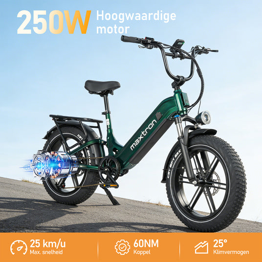 Le Maxtron Camel est un vélo électrique pliant élégant, parfait pour une utilisation quotidienne. Avec un puissant moteur de 250 W, une vitesse maximale de 25 km/h et un couple de 60 Nm, vous vous déplacez sans effort en ville et même en montée. Compact, pratique et fiable – idéal pour chaque trajet.