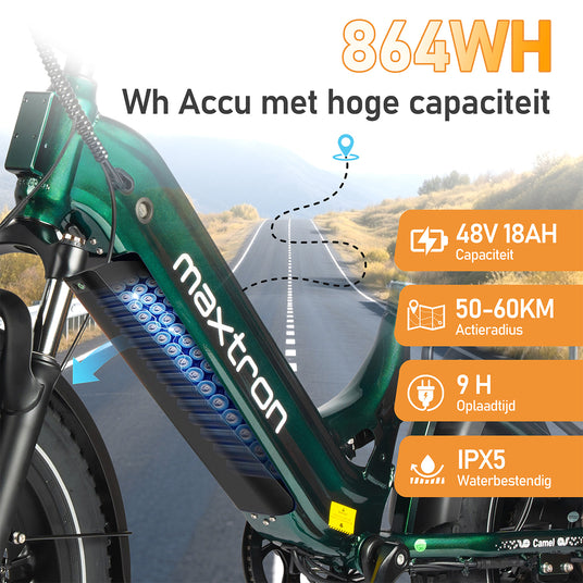 Le Maxtron Camel est équipé d'une batterie lithium-ion haute performance de 48V 18Ah (864Wh) qui assure une autonomie de 50 à 60 km. La batterie est amovible, ce qui permet de la recharger facilement à la maison. Une charge complète prend environ 9 heures. De plus, la batterie est résistante aux éclaboussures (IPX5), ce qui vous permet de rouler sereinement même par mauvais temps.