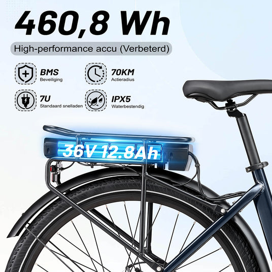 - Batterie 36V 12,8Ah (460,8 Wh) – Autonomie fiable jusqu'à 70 km