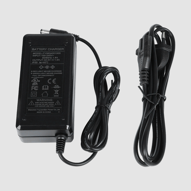 Chargeur noir, entrée CA 100–240 V, sortie CC 42 V 1,5 A, câble CA de 1,2 m, câble CC de 1 m avec connecteur mâle 5,5 × 2,1 mm, norme européenne