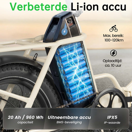 - 48V 20Ah (960 Wh) Accu – Lange actieradius tot 70 km